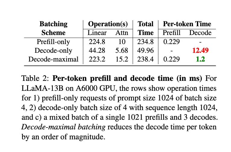 结果表明,混合 batch 能将每个 token 的解码时间显著降低一个数量级,大幅提升整体推理效率;同时,prefill 阶段的耗时几乎没有变化。