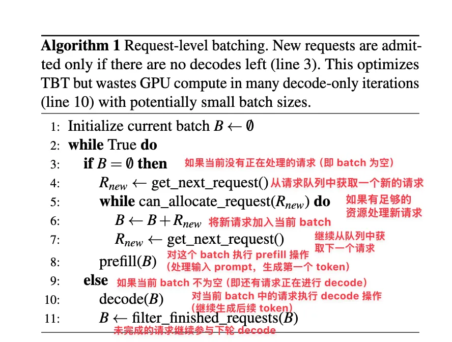 - 相反,若 batch 中以 decode 请求为主,例如所有请求都处于推理阶段,或没有新的输入序列可调度,则该 batch 很可能是 memory-bound 的,导致算力无法充分利用。