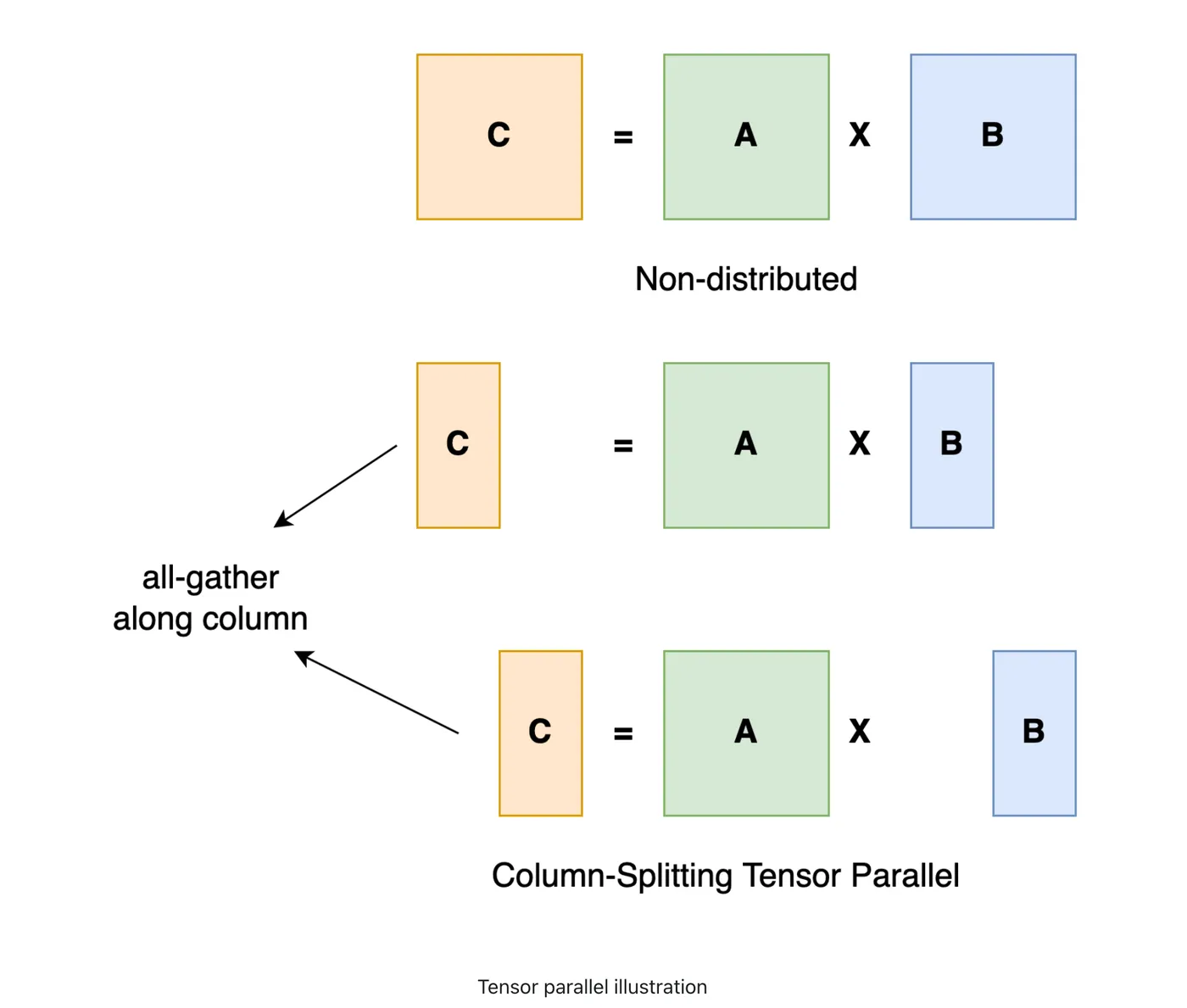 - 张量并行(Tensor Parallelism,TP) 将每一层的权重切分到多个 GPU 上,各 GPU 协同完成每一层的计算,KV cache 也被均匀分配。但这种方式每层都需要执行两次 All Reduce 操作(Attention 和 FFN 各一次),通信量大、延迟高,只适合在同节点内、如 NVLink 连接的高带宽环境下使用。