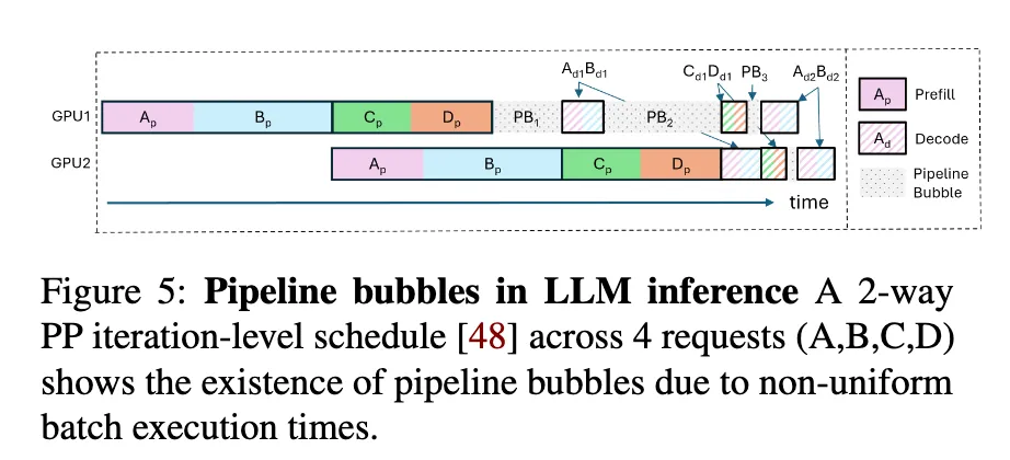 - PB2:prefill 阶段和 decode 阶段计算负载差异大。PB2 类型气泡出现在 prefill 和 decode 阶段相继执行时。以 Ad1 和 Bd1 为例,它们的 decode 阶段每次仅处理一个 token,计算时间极短;而此时 GPU2 正在处理 Cp 和 Dp 的 prefill,涉及多个 token,耗时较长,导致 GPU1 无法及时执行后续任务,资源被浪费,形成 PB2 气泡。