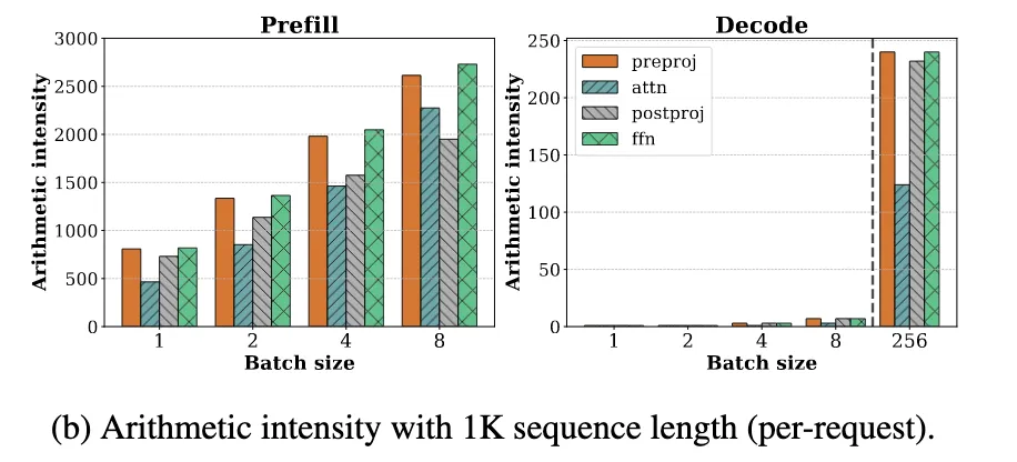 下图展示了 prefill 和 decode 阶段中各个操作的算术强度(arithmetic intensity)。如下图所示,在 prefill 阶段,即使 batch size 为 1,所有操作的算术强度依然很高。而在 decode 阶段,这些操作的算术强度下降了两个数量级以上,只有在 batch size 达到 256 这种极大值时,decode 阶段才开始变得计算密集。