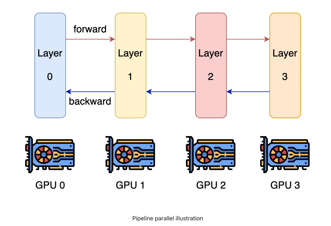 举个例子,如果一个 batch 有 64 个样本,可以被拆成 8 个 micro-batch,每个包含 8 个样本,在模型各阶段中交错处理,从而避免 GPU 空转,提高执行效率。每个阶段表示模型中一部分连续的层,由一个 GPU 负责计算。例如,在一个 12 层的 Transformer 模型中,若使用 4 个 GPU,则每个阶段可能包含 3 层。
