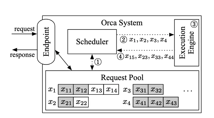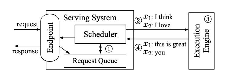下展示了 ORCA 采用迭代级调度(iteration-level scheduling)时的系统架构与整体工作流程: