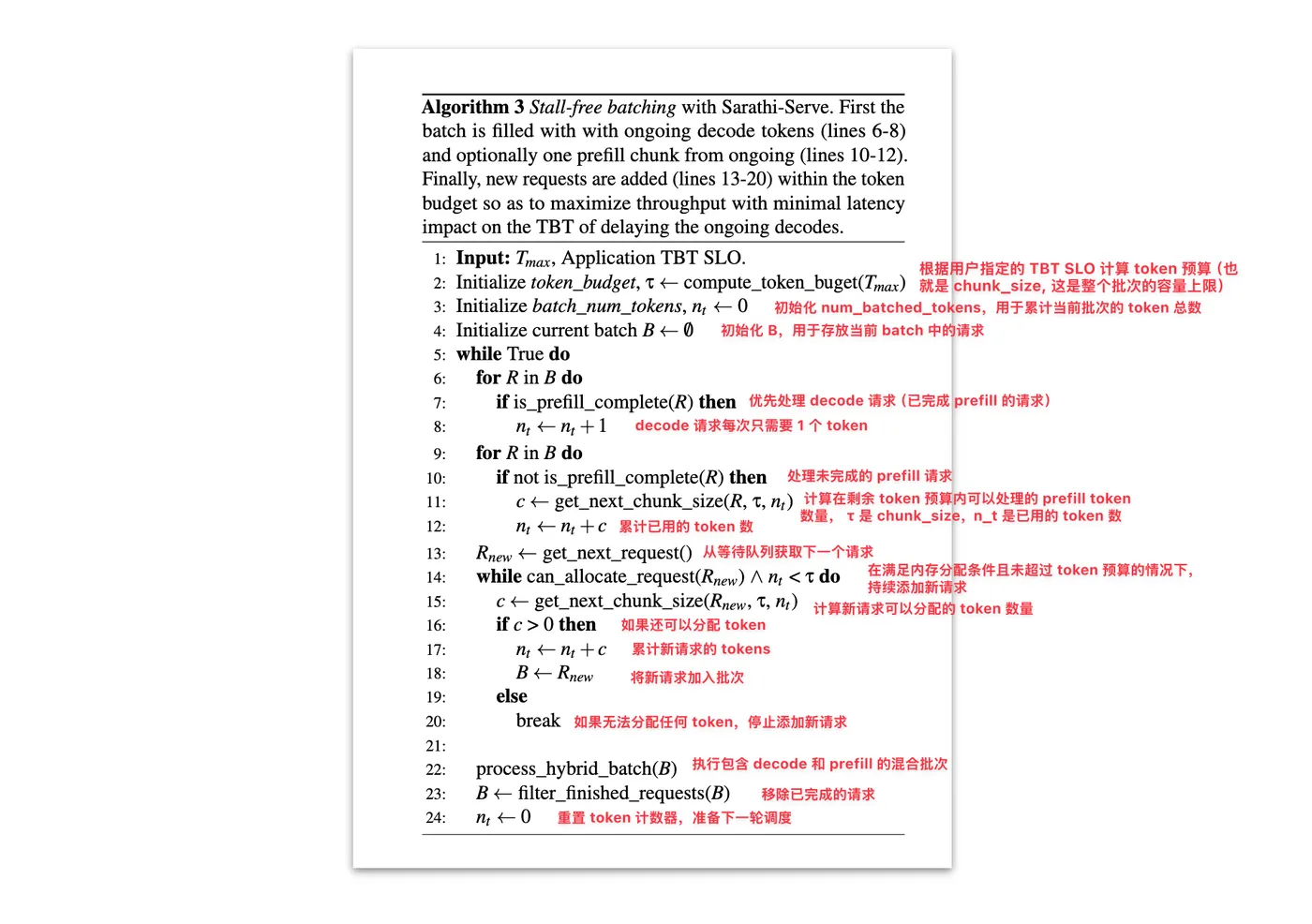 在 Sarathi-Serve 的实现代码中,chunk_size 明确用于表示每轮迭代中 token 数的上限(即 token budget)。为了避免混淆,本文中所提到的 chunk size 均指 每轮迭代的 token 上限。