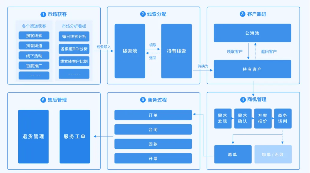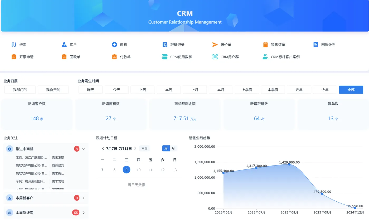- 客户管理、销售跟进、商机管理、报价、合同、回款、客户分析;