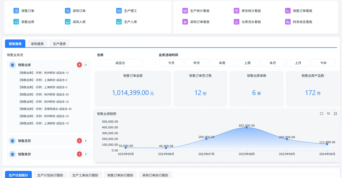 在这个经营看板上,订单、采购、出入库、财务报表全部实时更新,老板一看就知道企业经营状况。