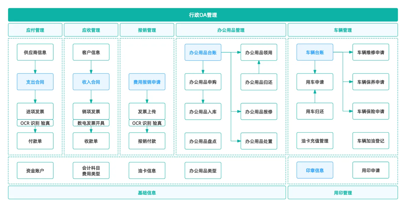 - OA,就是管内部员工、内部流程的—— 比如考勤、请假、报销、用车、物资申请。