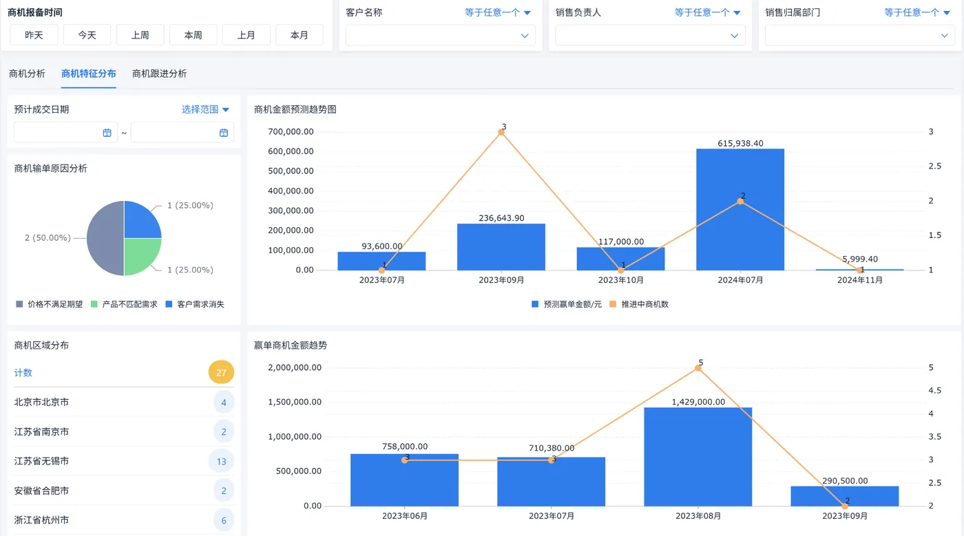 - 老板、销售主管实时看客户进展、成交预测、销售报表;