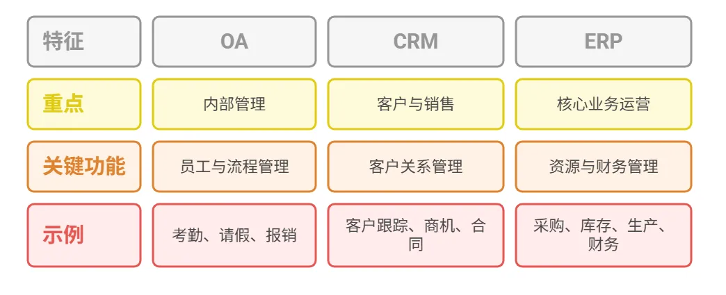 很多企业老板面对OA、CRM、ERP时,最焦虑的问题,不是“这些系统管啥”,而是: