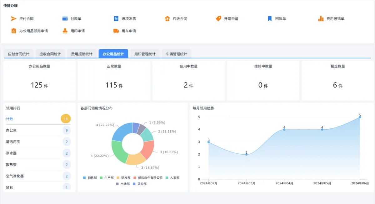 - 行政部 → 办公用品、用车、用印模块的操作和审批
