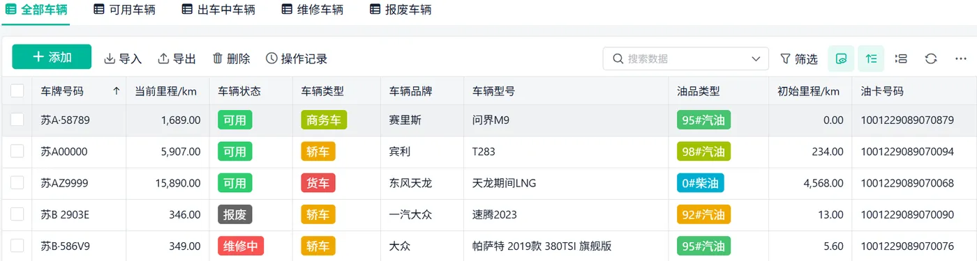 - 车辆管理 → 用车申请 → 归还 → 维修/保养/加油登记