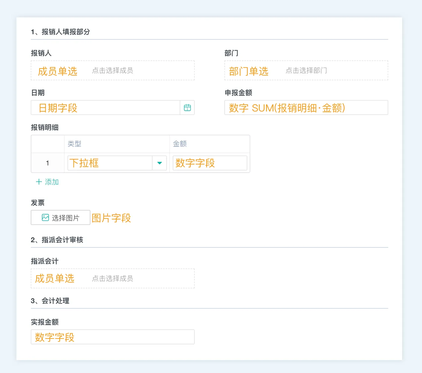 - 报销单 → 报销人、部门、金额、发票、费用类别、事由