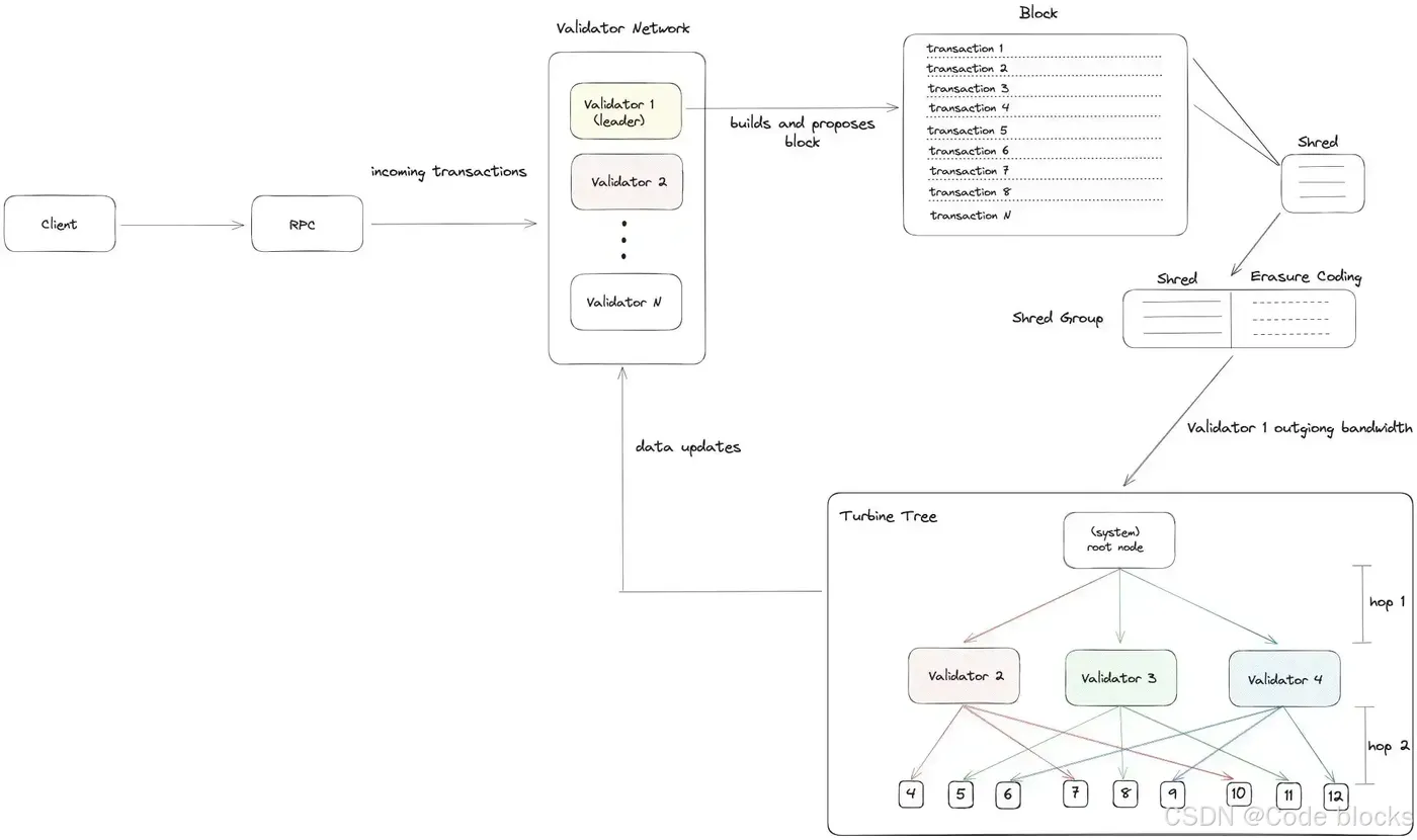 Turbine 算法是一种用于区块链网络(尤其是 Solana 区块链)中高效数据传输和共识的算法。它的核心目标是在高吞吐量和低延迟的网络环境中,优化数据的传播和验证过程。Turbine 是 Solana 区块链的关键组件之一,帮助其实现每秒处理数万笔交易的能力。