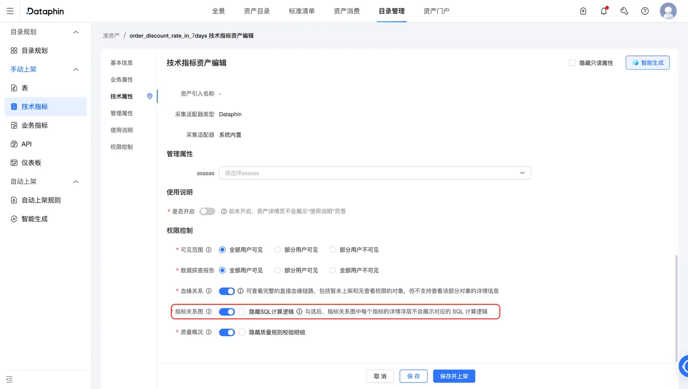 1. 技术指标提交并发布后,资产运营人员可以在「资产」-「目录管理」-「技术指标」的准资产页面找到相应指标。在编辑页面开启指标关系图选项,并完善指标资产信息后上架。