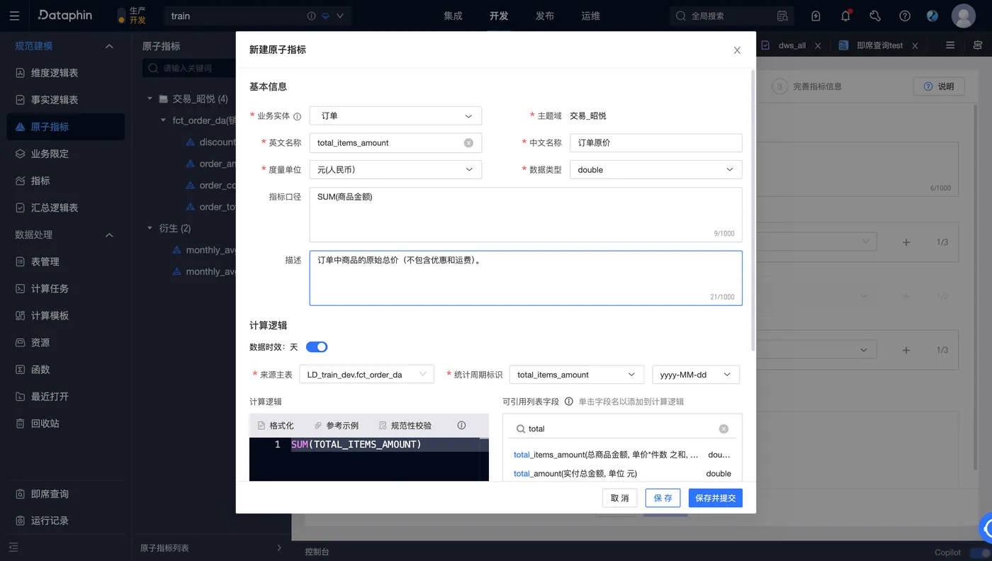 1. 在「研发」-「规范建模」-「原子指标」页面,创建“商品原价”等原子指标,并填写指标口径和描述,然后提交并发布。