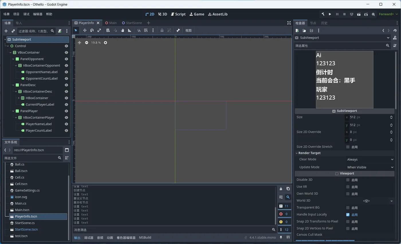 创建玩家信息场景PlayerInfo.tscn,使用SubViewPort作为根节点,以便能够嵌套入游戏主场景中。该场景分别显示对手信息,玩家信息,倒计时,当前回合,参考场景设置如下: