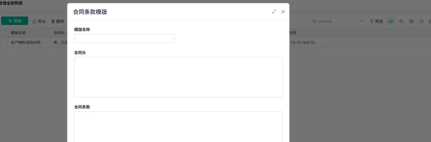 合同条款模板管理功能用于创建和管理合同的标准条款。这些模板包括常见的合同条款,如付款条款、交货条款、违约责任等。通过条款模板的管理,企业可以确保每份合同的内容统一规范,避免遗漏关键条款。