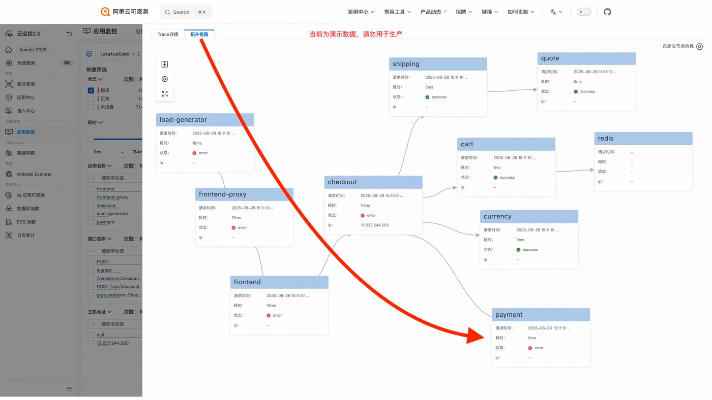 结合拓扑视图、Copilot 分析、日志校验,可定位根因系payment服务出现故障: