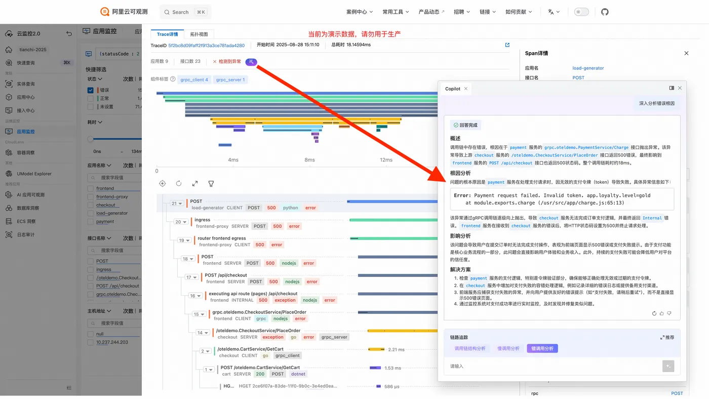 在Trace详情页面,点击检测到异常右侧的魔棒按钮,可展开 Copilot 并向其提问: