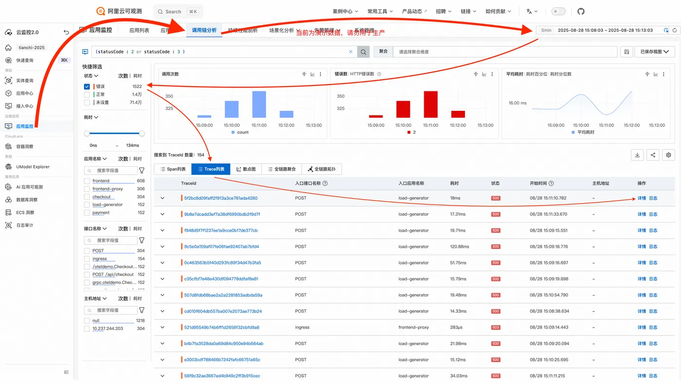快捷筛选栏,选定错误状态,可得故障时段内全部错误调用; - 进入
