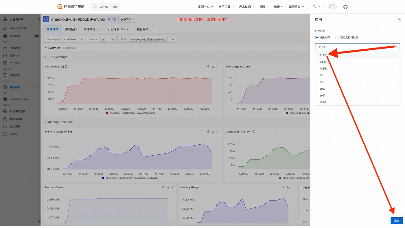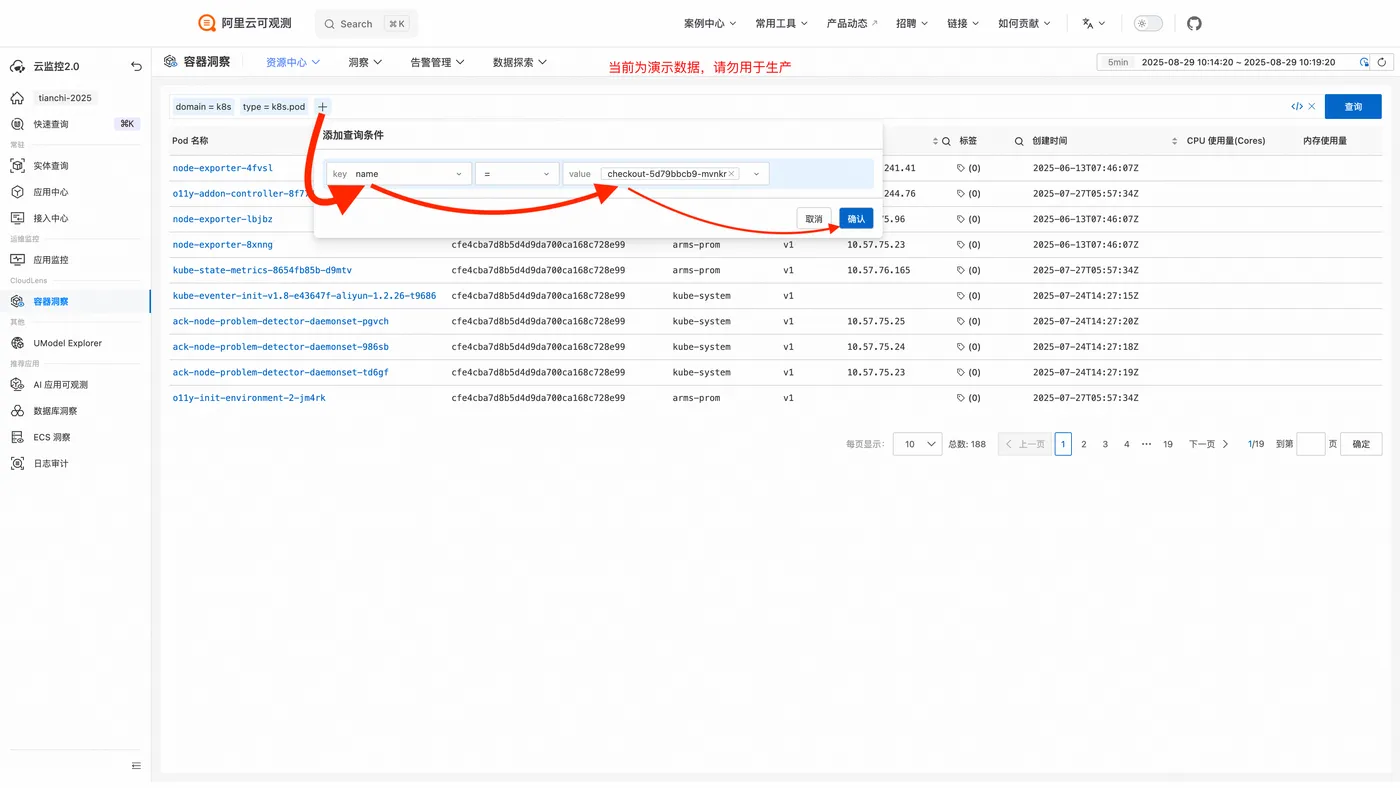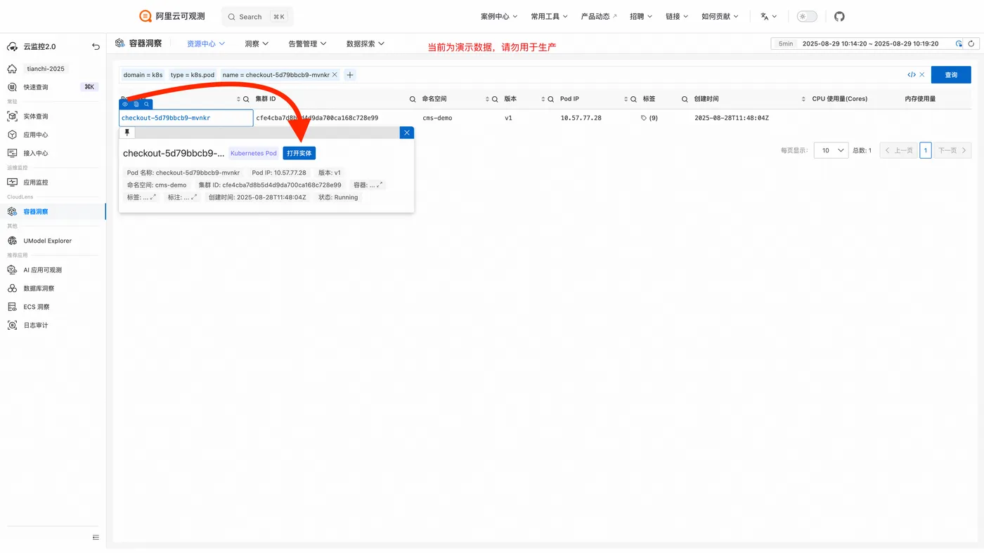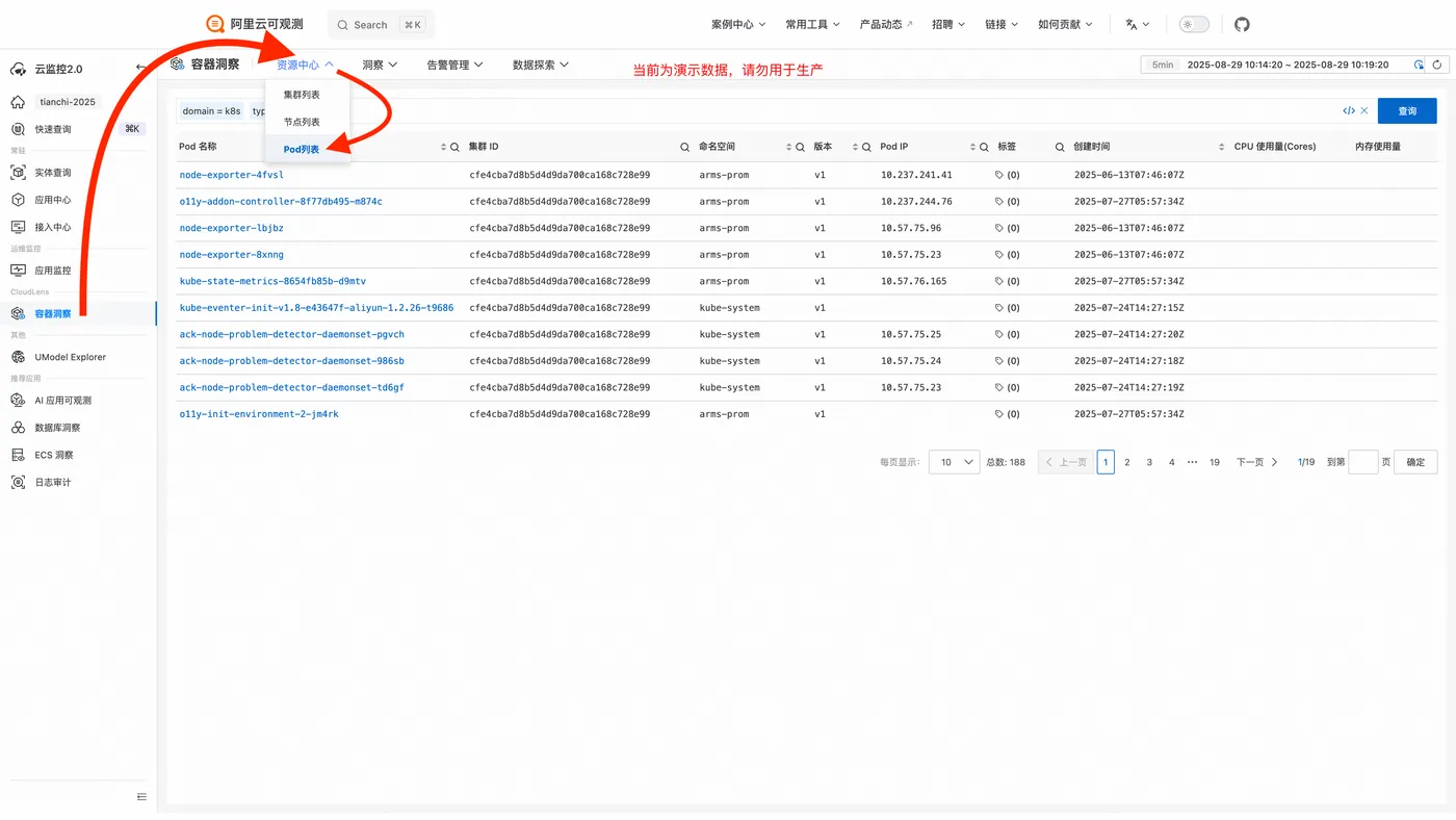 在左栏菜单点击容器洞察,悬停展开资源中心菜单,点击Pod列表:
