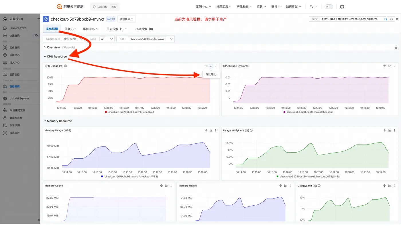 在实体详情页面,CPU Resource栏目下点击CPU Usage图表中的同比环比按钮: