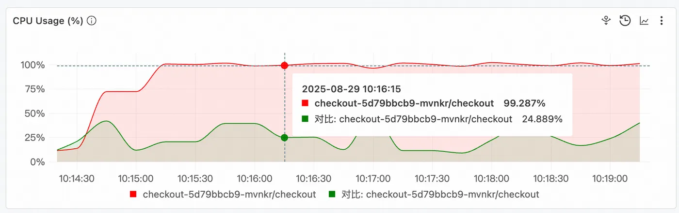 对比 1 小时前的数据可发现:CPU 使用率从 24.889%显著上升至 99.287%,可视为异常。