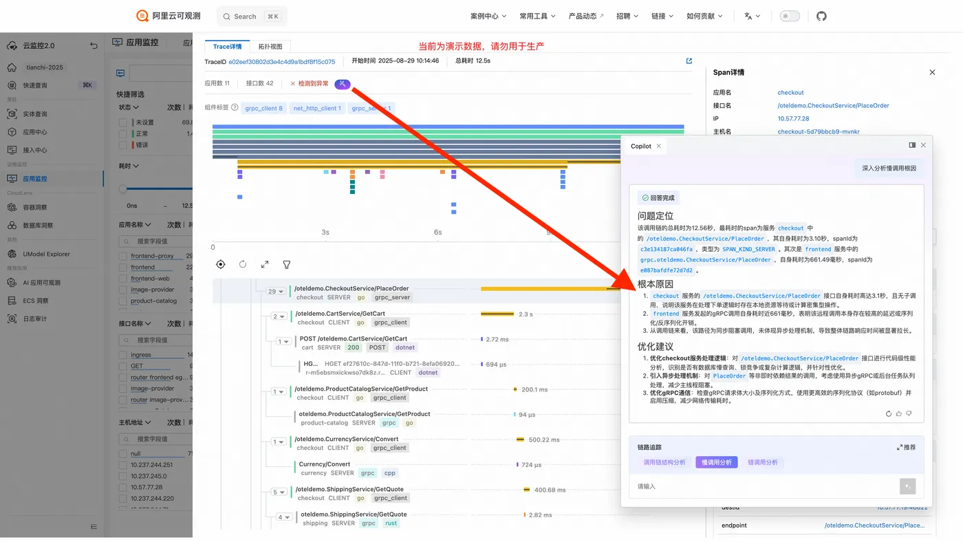 结合调用链视图与 Copilot 分析结果,观察独占耗时高的调用段(Span)及其性能指标,可以定位故障根因系checkout出现 CPU 负载故障。