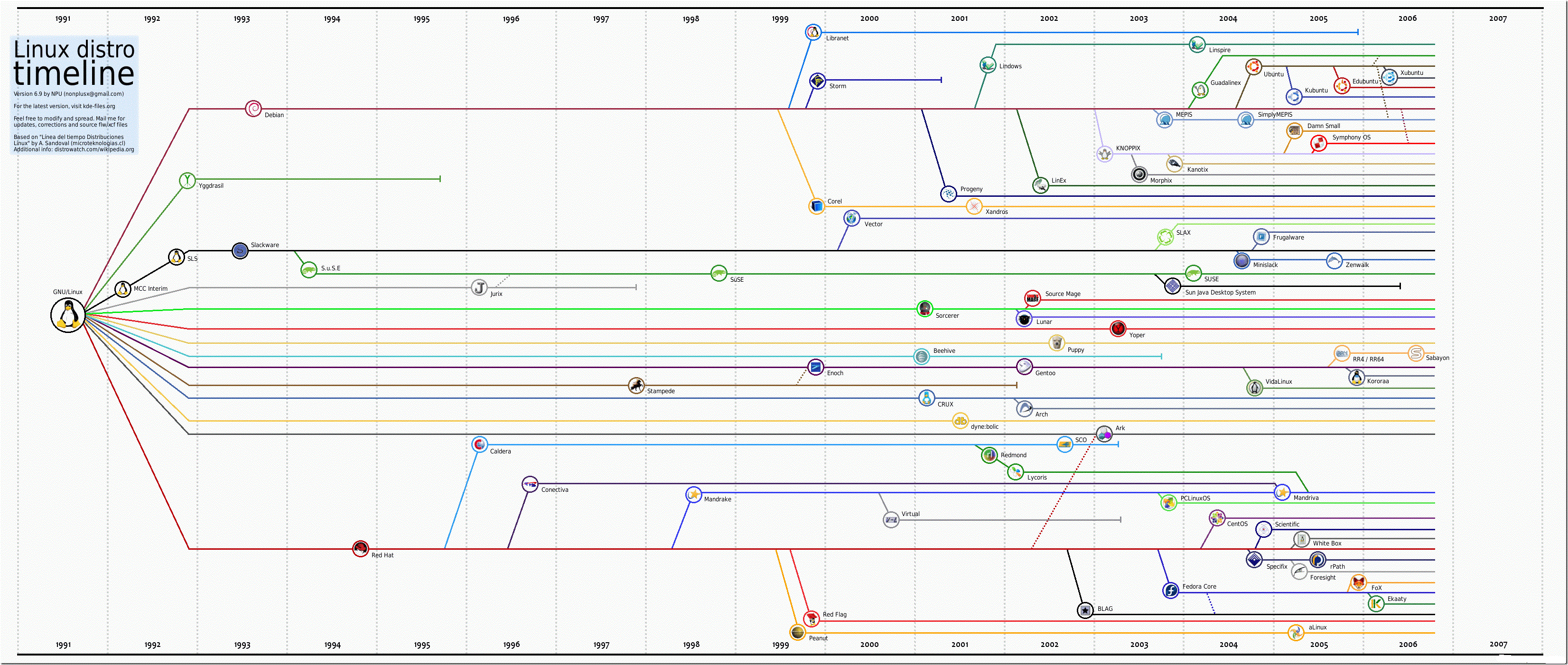自1991年发布LInux内核来,很多公司加入其中,在内核的基础上构建了自己的操作系统版本,比如Redhat、Debian和Suse等等。如图2是从1991年到2007年间Linux发行版的演化情况(高清图请私信, linuxtl)。可以看出,到2007年已经有不少于20个发行版了。