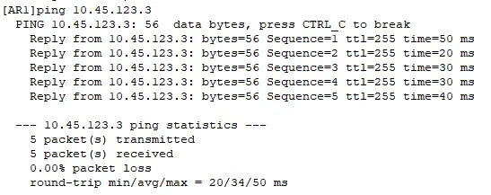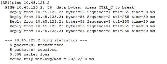[AR1]ping 10.45.123.2 PING 10.45.123.2: 56 data bytes, press CTRL_C to break Reply from 10.45.123.2: bytes=56 Sequence=1 ttl=255 time=70 ms Reply from 10.45.123.2: bytes=56 Sequence=2 ttl=255 time=10 ms Reply from 10.45.123.2: bytes=56 Sequence=3 ttl=255 time=10 ms Reply from 10.45.123.2: bytes=56 Sequence=4 ttl=255 time=110 ms Reply from 10.45.123.2: bytes=56 Sequence=5 ttl=255 time=40 ms --- 10.45.123.2 ping statistics --- 5 packet(s) transmitted 5 packet(s) received 0.00% packet loss round-trip min/avg/max = 10/48/110 ms