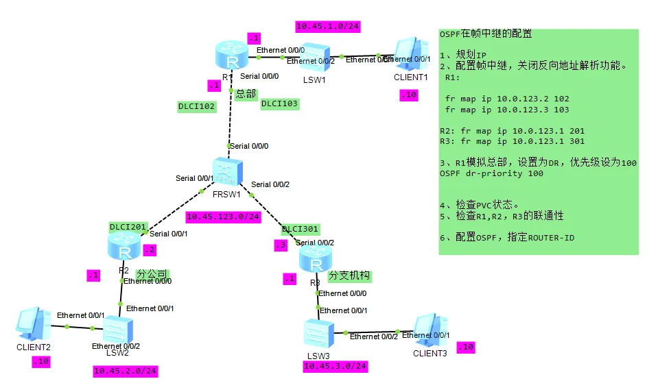 <Huawei>sys Enter system view, return user view with Ctrl+Z. [Huawei]sys AR1 [AR1]link-protocol fr ietf [AR1]int s0/0/0 [AR1-Serial0/0/0]link-protocol fr ietf Warning: The encapsulation protocol of the link will be changed. Continue? [Y/N]:y [AR1-Serial0/0/0]ip add 10.45.123.1 24 [AR1-Serial0/0/0]undo fr inarp [AR1-Serial0/0/0]fr map ip 10.45.123.2 102 [AR1-Serial0/0/0]fr map ip 10.45.123.3 103 [AR1-Serial0/0/0]ospf dr-priority 100 [AR1-Serial0/0/0]q [AR1]int e0/0/0 [AR1-Ethernet0/0/0]ip add 10.45.1.1 24 [AR1-Ethernet0/0/0]q