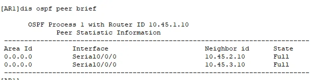 [AR1]dis ospf peer OSPF Process 1 with Router ID 10.45.1.1