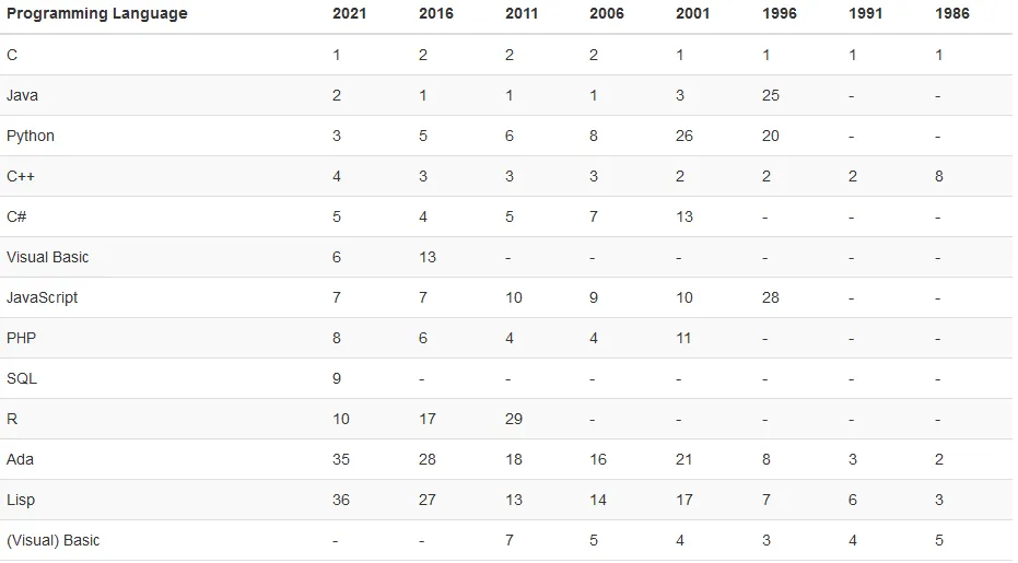 对此,TIOBE 官方预测,Python 即将接管 TIOBE 榜单榜首的位置。与此同时,TIOBE 索引榜单即将于下个月迎来 20 周年。在过往 20 年间,仅有两种语言达到过 TIOBE 榜单第一的位置,它们分别是 C 和 Java 语言。因此,在高速的发展趋势下,Python 在不久的将来或将超越 C 语言成为榜单的第一名,而届时势将会成为历史中重要的一个时刻。