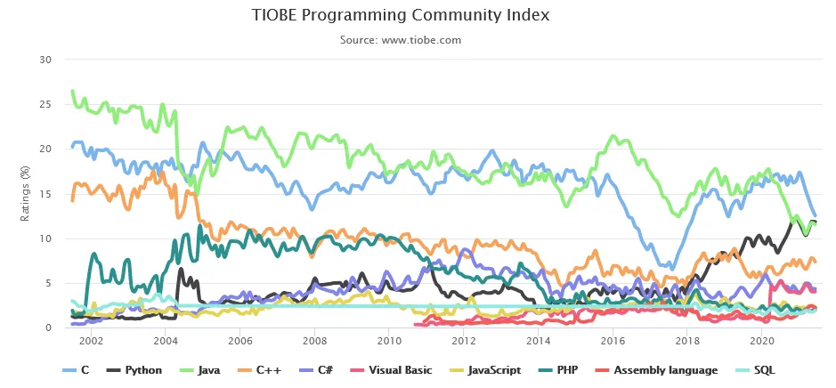 Top 10 编程语言 TIOBE 指数走势(2002-2020)