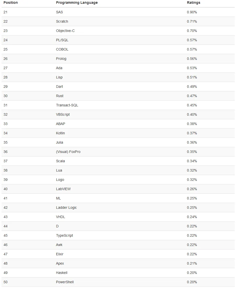 另外,近几个月间,我们发现 Java 的市场份额在持续下降,市场份额比上个月少 0.2%,且其增长趋势为 -4.56%。除此之外,TOP 20 中还有一些值得关注的变化: