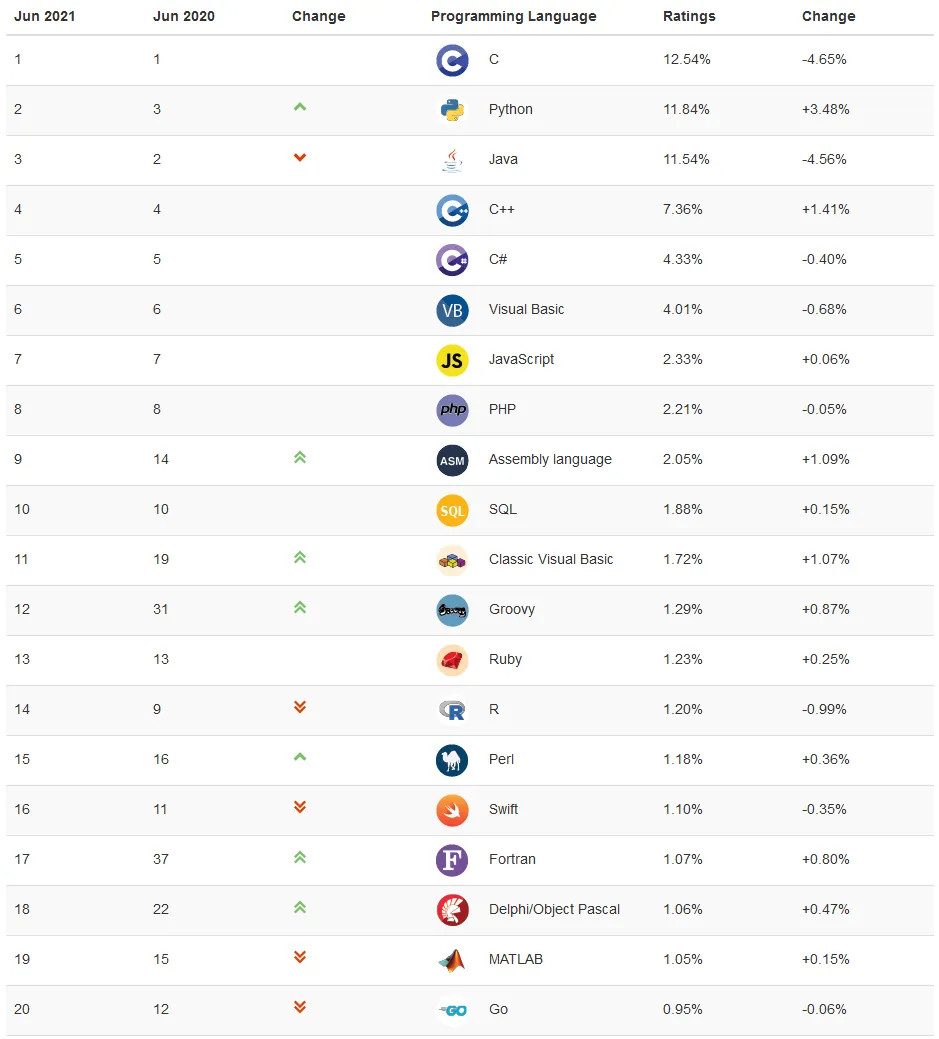 在本月榜单中,位居第二名的 Python 与第一名 C 语言之间的差距正在逐渐缩小,从上个月的 1.51% 缩小到了本月的 0.7%。