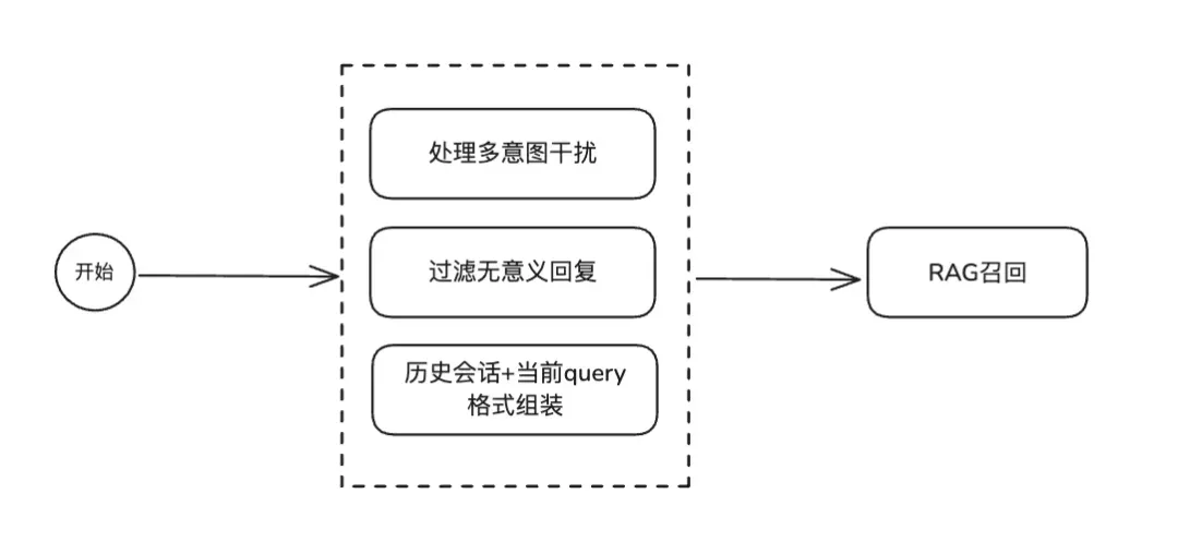 如果所使用的智能体平台本身具备历史会话与当前query联合召回的功能,自然是理想选择。然而,若平台未提供此功能,则需要自行进行相应的技术改造。在实施过程中,可能会遇到一些技术挑战,例如需要过滤多轮对话中的干扰信息,如卡片信息、无意义输出以及可能引起意图混淆的噪声内容等(关于意图混淆问题解法,在下一个节点会给出方案)。