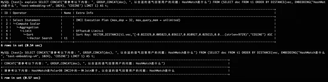 SELECT CONCAT("请参考以下内容: ", GROUP_CONCAT(doc), ", 以合适的语气回答用户的问题: HashMatch是什么")FROM(SELECT doc FROM t1 ORDER BY DISTANCE(vec, EMBEDDING("HashMatch是什么", "text-embedding-v4", 1024), 'COSINE') LIMIT 1) AS t;