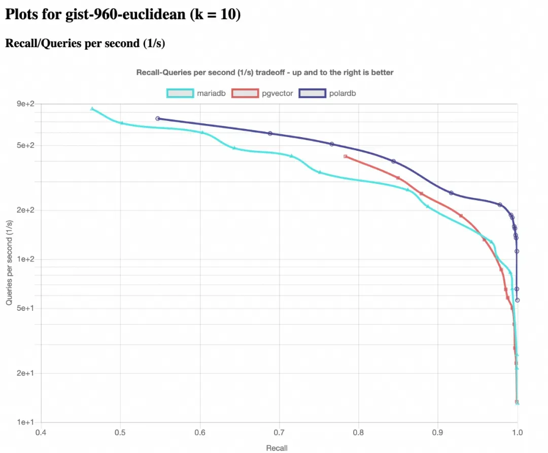 我们在公开的GIST-960数据集上,将PolarDB IMCI与开源PGVector及MariaDB进行了性能对比。在同等硬件规格下(见附录),测试结果显示:在不同的召回率下,PolarDB IMCI的向量检索性能(QPS)是其他两款产品的2-3倍。