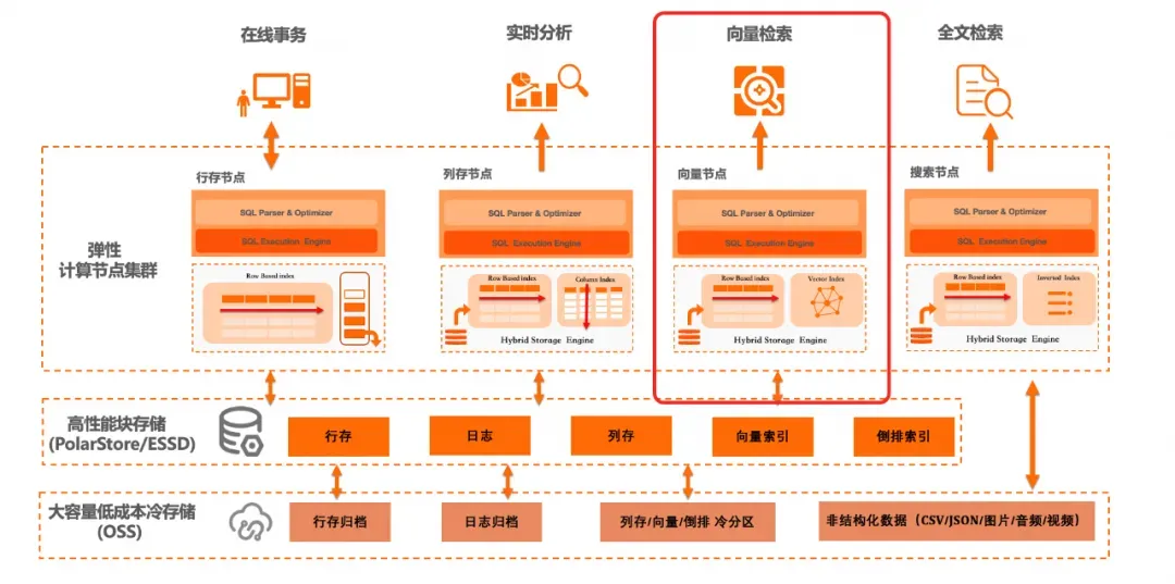为了解决这些难题,PolarDB IMCI(In-Memory Column Index,简称IMCI)提出了一套全新的解决方案——在数据库内核中集成向量索引与Embedding能力,构建了一个多模态混合检索架构,致力于为开发者提供一体化的向量全生命周期管理服务。