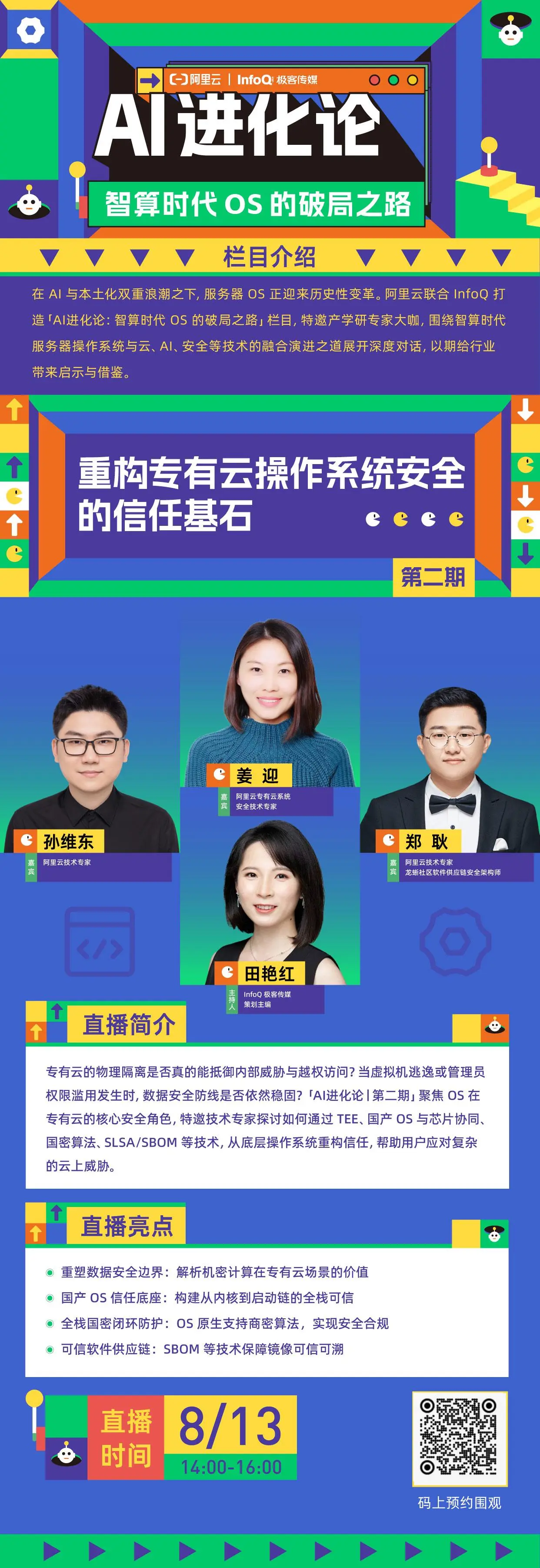 首期已于 7 月 30 日重磅上线,线上直播观看人次高达 13 万+。《AI 进化论:智算时代操作系统的破局之路》系列直播第二期「重构专有云操作系统安全信任基石」将于 8 月 13 日 14:00 开始,聚焦 OS 在专有云的核心安全角色,特邀龙蜥社区软件供应链安全架构师郑耿,阿里云技术专家孙维东,阿里云专有云系统安全技术专家姜迎,InfoQ 极客传媒策划主编田艳红四位嘉宾,探讨如何通过 TEE、国产 OS 与芯片协同、国密算法、SLSA/SBOM 等技术,从底层操作系统重构信任,帮助用户应对复杂的云上威胁。