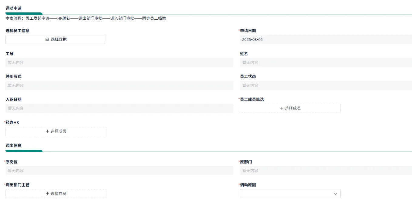• 员工侧:填写调动申请单,指定生效日期,可以上传补充说明;实时查看审批进度。