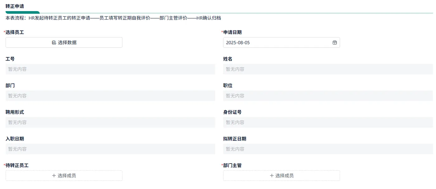 • 转正管理:帮HR和部门主管统一审批员工试用期转正,自动触发薪资、权限调整。