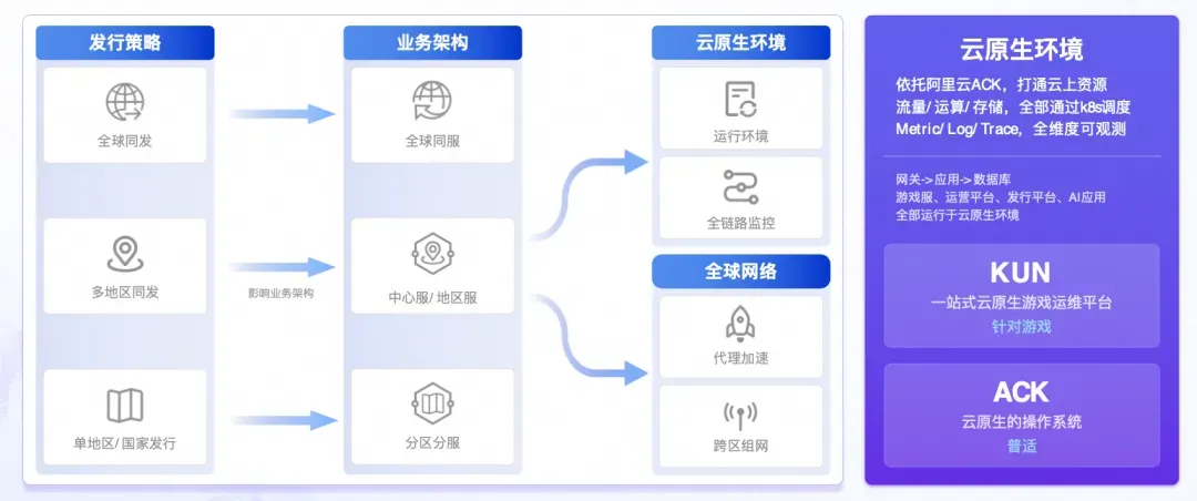 即构建一条自底向上的出海路径,以 ACK 为核心构建云原生底座 → 叠加 KUN 的专属运维能力 → 通过全球网络连接玩家 → 支撑不同发行策略的业务架构。