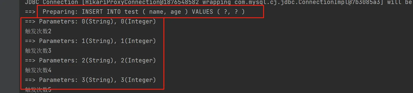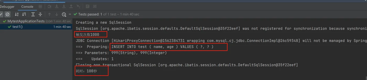 @Test void test3() { List<MyTest> list = new ArrayList<>(); for (Integer i = 0; i < 1000; i++) { MyTest test = MyTest.builder().name(i.toString()).age(i).build(); list.add(test); } long startTime = System.currentTimeMillis(); testMapper.batchInsert(list); long endTime = System.currentTimeMillis(); System.out.println("耗时:" + (endTime - startTime) / 1000 + "秒"); }