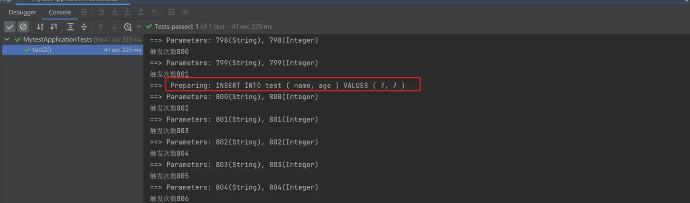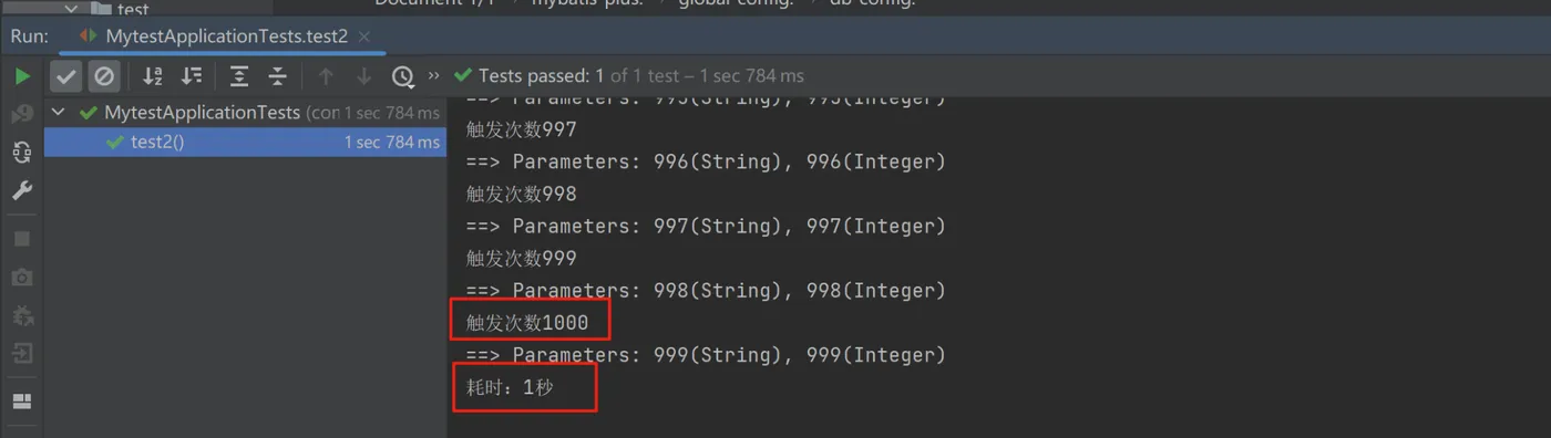 @Test void test2() { List<MyTest> list = new ArrayList<>(); for (Integer i = 0; i < 1000; i++) { MyTest test = MyTest.builder().name(i.toString()).age(i).build(); list.add(test); } long startTime = System.currentTimeMillis(); testService.saveBatch(list, 200); long endTime = System.currentTimeMillis(); System.out.println("耗时:" + (endTime - startTime) / 1000 + "秒"); }