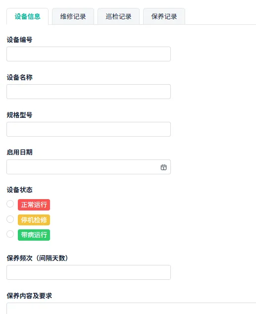 - 功能:记录设备信息(电梯、消防设施等)、巡检计划、维修记录。