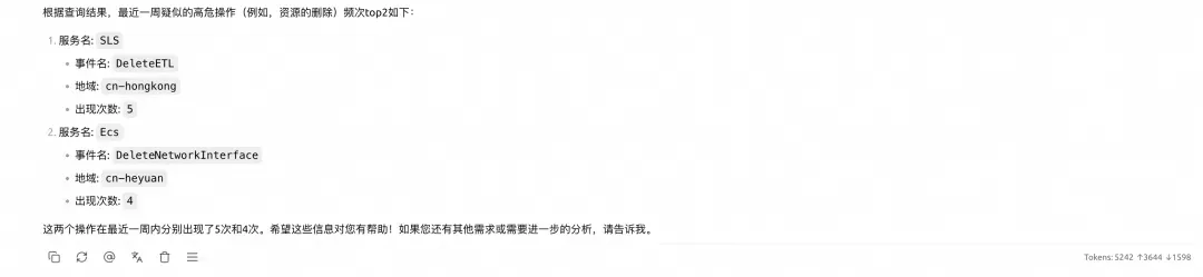 小王继续问: "最近一周,有没有人干过删除、更新这种危险操作?把最可疑的用户找出来,告诉我他们的操作的服务和事件名!"