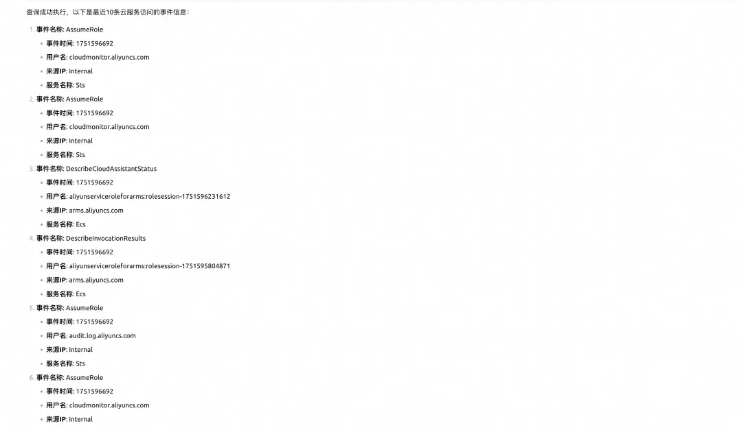 最后,小王想了解整体的系统活动情况: "给我看看最近的云服务访问情况,列出 10 条近期的事件信息!"