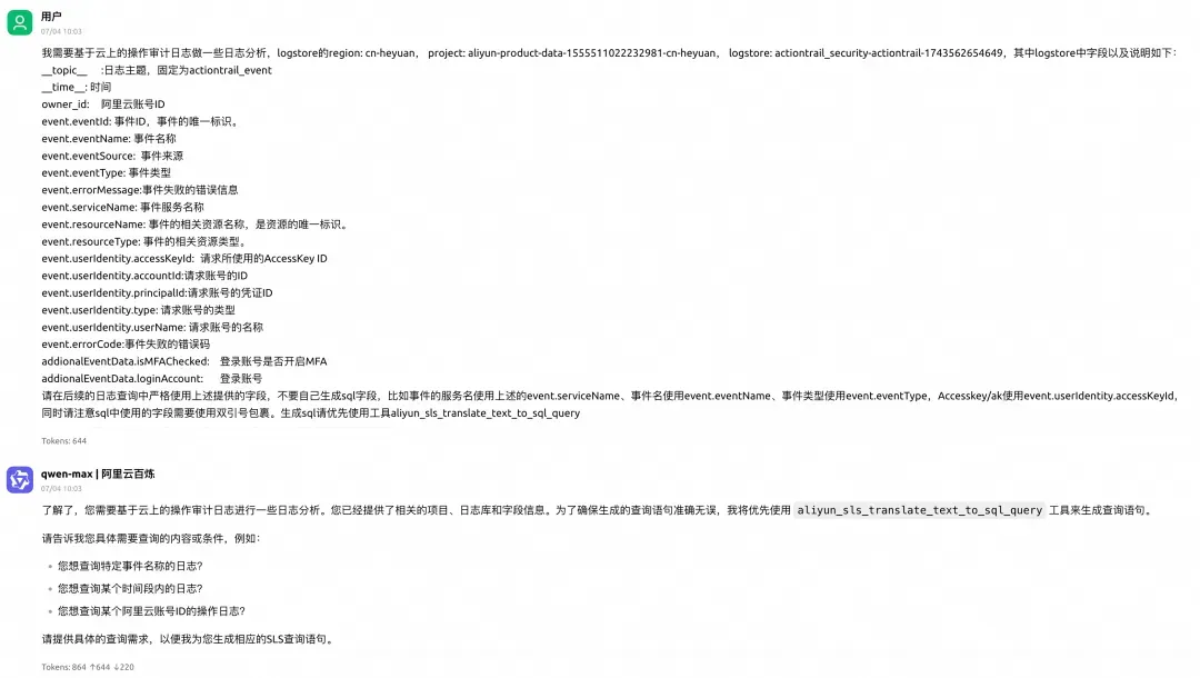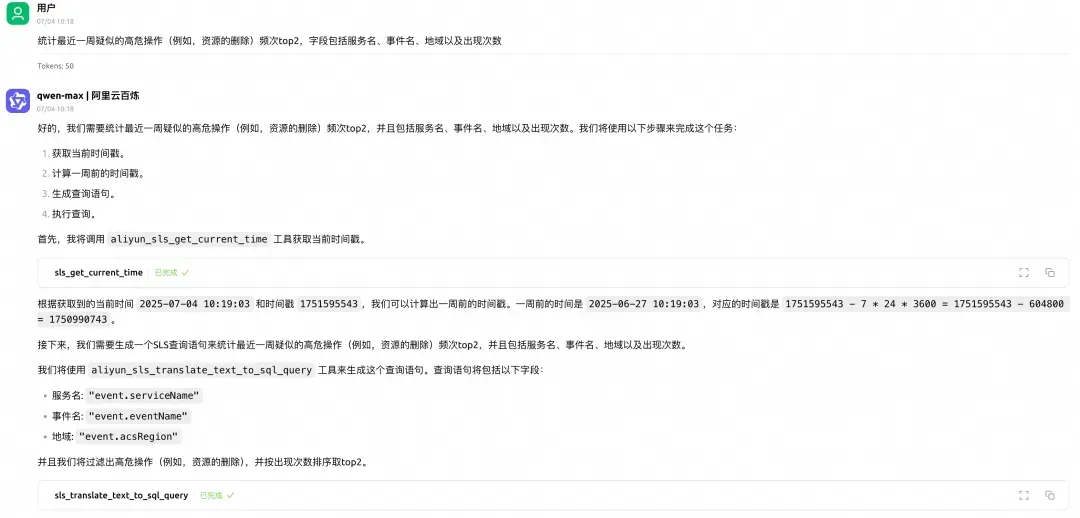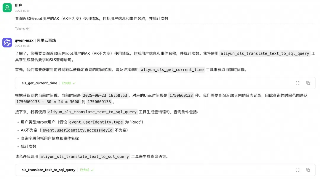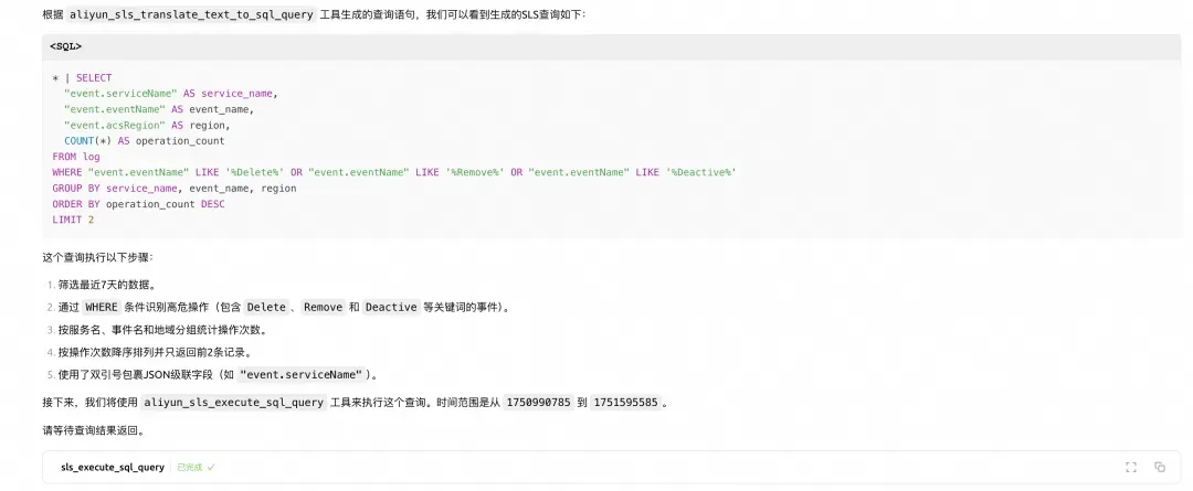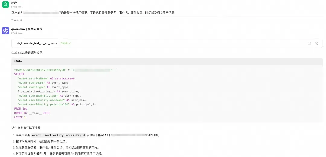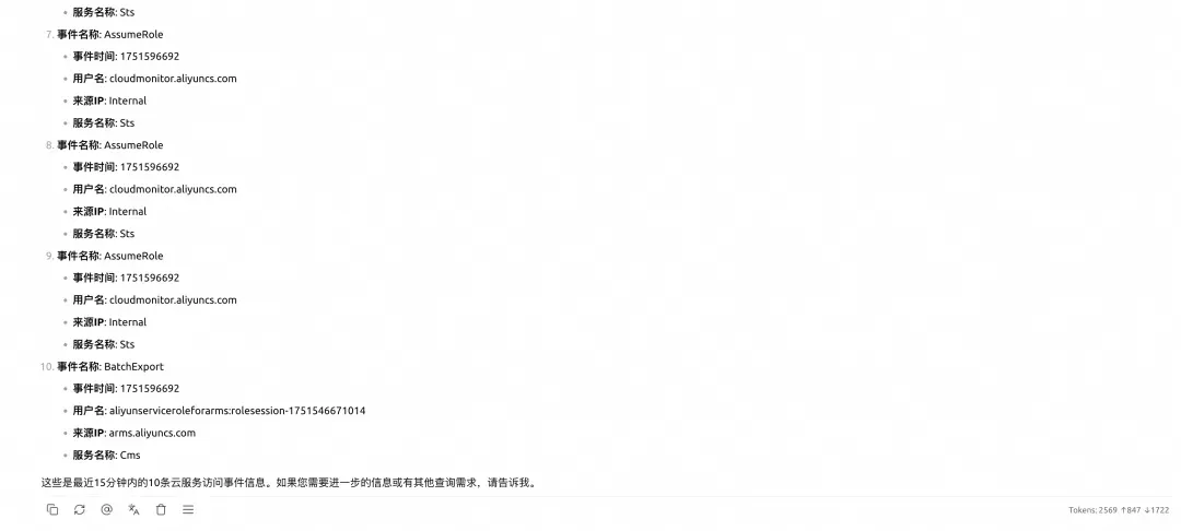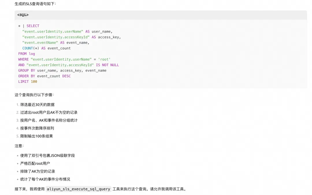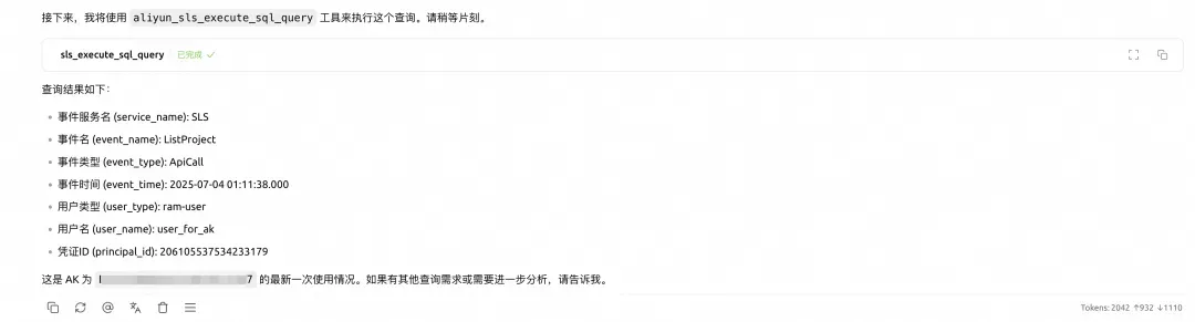 MCP 迅速响应,几秒钟内就给出了答案。原来,这个 AK 在凌晨时分执行了 SLS 项目查询操作。虽然看起来是普通的查询,但在深夜时段的异常活动立即引起了小王的警觉。通过这条线索,安全团队迅速锁定了用户活动轨迹,为后续的深入调查奠定了基础。